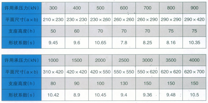本系列支座不存在水平位移,主司豎向減震之功能;因?yàn)橛新菟ㄏ尬唬豢紤]支座的水平剪切,故下表2的參數(shù)較為簡(jiǎn)單。這種支座是比較常用的類型,在中南林業(yè)科技大學(xué)、深圳外國(guó)語(yǔ)學(xué)校等工程的設(shè)計(jì)過(guò)程中,我們根據(jù)工況需求配合有關(guān)方面進(jìn)行了創(chuàng)造性的深化設(shè)計(jì)。