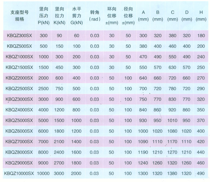 4 KBQZ系列抗拔球型支座 本系列支座主要分為抗拔球型支座和減震抗拔球型支座,下面對其進行分類介紹。4.1抗拔球型支座 此類支座分為固定型、單向位移型和雙向位移型,支座結(jié)構(gòu)如圖3。其主要由支座頂板、不銹鋼板、平面聚四氟乙烯滑板、球冠襯板、球面聚四氟乙烯滑板、中支架、聚四氟乙烯滑板、不銹鋼板和滑移箱組成。支座中的相對滑移部件之間,采用目前世界上摩擦系數(shù)最低的聚四氟乙烯滑板和不銹鋼板相隔,充分減小了摩擦阻力,使各部分之間的運動流暢,避免爬行現(xiàn)象的產(chǎn)生。本類支座通過球面聚四氟乙烯滑板上部構(gòu)件沿著球面相對于下部構(gòu)件的轉(zhuǎn)動實現(xiàn)轉(zhuǎn)角(常用值為0.02rad),在工作過程中支座沿著滑移箱滑道滑動實現(xiàn)水平位移。 豎向壓力的傳遞是通過支座頂板,不銹鋼板,平面聚四氟乙烯滑板,球冠襯板,球面聚四氟乙烯滑板,中支架,聚四氟乙烯滑板,不銹鋼板依次疊加傳至滑移箱底板。 豎向拔力的傳遞是通過支座頂板和中支架的抗拔接觸面將作用于支座頂板上的上.拔力傳至中支架,再由中支架與滑移箱之間的抗拔四氟滑板和不銹鋼板將力傳至滑移箱頂板。 水平力的傳遞是通過支座頂板側(cè)壁與中支架側(cè)壁之間.的接觸面將水平力傳至中支架,再由中支架與滑移箱的接觸面?zhèn)髦粱葡鋫?cè)壁根部。 固定型抗拔球型支座不設(shè)滑移箱。4.1.1普通抗拔雙向位移型球型支座KBQZ-SX普通抗拔雙向位移型球型支座參數(shù)表 表74.1.2普通抗拔單向位移型球型支座KBQZ-DX普通抗拔單向位移型球型支座參數(shù)表 表84.1.3普通抗拔固定型球型支座KBQZ-GD普通抗拔固定型球型支座選用參數(shù)表 表9